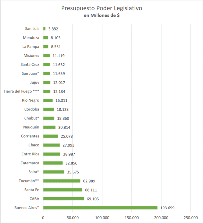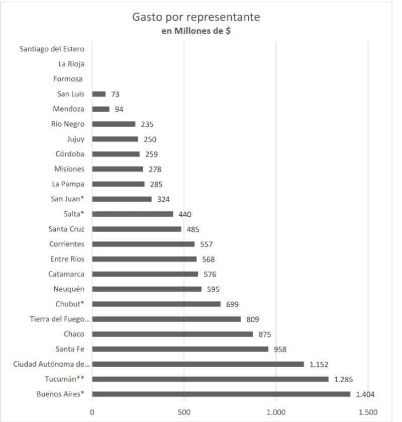 De acuerdo a los datos relevados del gasto por representante, el mayor desembolso se realiza en la provincia de Buenos Aires seguida de la provincia de Tucumán. Este gasto (el de Tucumán) es un cálculo que se basa en lo declarado por el vicegobernador de la provincia en el diario La Gaceta, porque no existe información oficial disponible sobre el gasto de la legislatura.