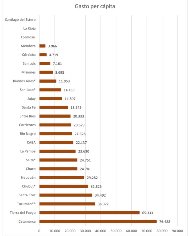 Del análisis se desprende que la provincia con mayor gasto es Buenos Aires, y la provincia con menor gasto es San Luis. "Cuando miramos cuanto representa el gasto legislativo sobre el gasto total, el mayor porcentaje corresponde a Tucumán, y el menor a Mendoza. Y si miramos el gasto del poder Legislativo por habitante, el mayor gasto per cápita es el de Catamarca y el menor es el de la provincia de Mendoza", detallan.