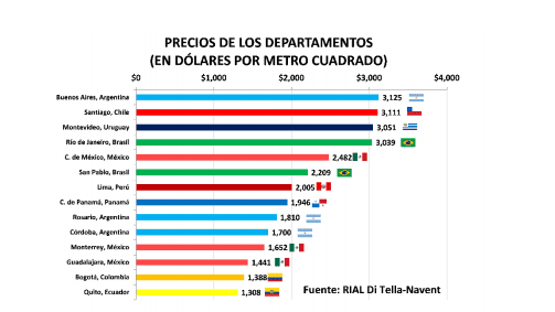 Mientras que las ciudades más baratas de la región son Quito en US$ 1.308 por m2, Bogotá US$ 1.388, Guadalajara US$ 1.441 y Monterrey US$ 1.652.