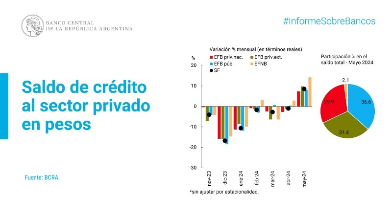 El saldo de financiamiento en pesos al sector privado se incrementó 8,5% real en mayo (luego de 6 meses consecutivos de caída), con aumentos en todas las líneas crediticias y grupos de entidades financieras. El saldo de financiaciones en moneda extranjera creció 9,8% (+54,7% i.a.), dinamizado mayormente por las líneas comerciales.