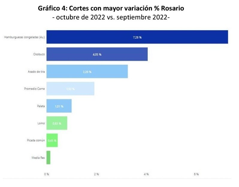 Las variaciones de precios más relevantes del mes de octubre de 2022 en Rosario se dieron en hamburguesas congeladas (+7,28%), osobuco (+4,05%), y asado de tira (+3,26%). Los cortes con menor variación se dieron en el lomo (+0,83%), la picada común (+0,45%) y la media res (+0,15%).