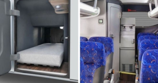 Los modelos con los que están llegando son los nuevos Aries 345 y 365, que se destacan por su alto nivel de seguridad al superar los ensayos de vuelco de la Unión Europea, cinturones de tres puntos como los de autos, sistema de cámara, freno y radar automático, corrección de carril y vibración de asiento en caso de que el conductor se quede dormido. En materia de confort, ofrecen una mini habitación con cama para el acompañante del conductor, frigobar con bebidas calientes y frías, iluminación interna led que adapta el color e intensidad al ambiente y la hora del día, asiento súper soft con mayor reclinación, mayor separación entre pasajeros y cabina, y calefacción frío calor teniendo en cuenta que estos vehículos también son llevados a lugares con temperaturas muy bajas.