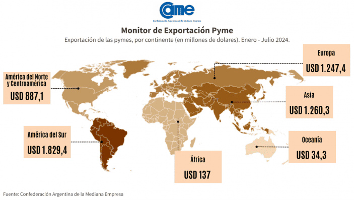 Así surge del Monitor de Exportación Pyme (MEP), un indicador elaborado por el sector de Estadísticas e informes de la Confederación Argentina de la Mediana Empresa (CAME) para medir las exportaciones de las pequeñas y medianas empresas de la República Argentina, en base al monitoreo mensual de las operaciones de las empresas argentinas en el comercio exterior, discriminando por su condición pyme declarada ante la Secretaría de la Pequeña y Mediana Empresa, Emprendedores y Economía del Conocimiento, dependiente del Ministerio de Economía de la Nación.