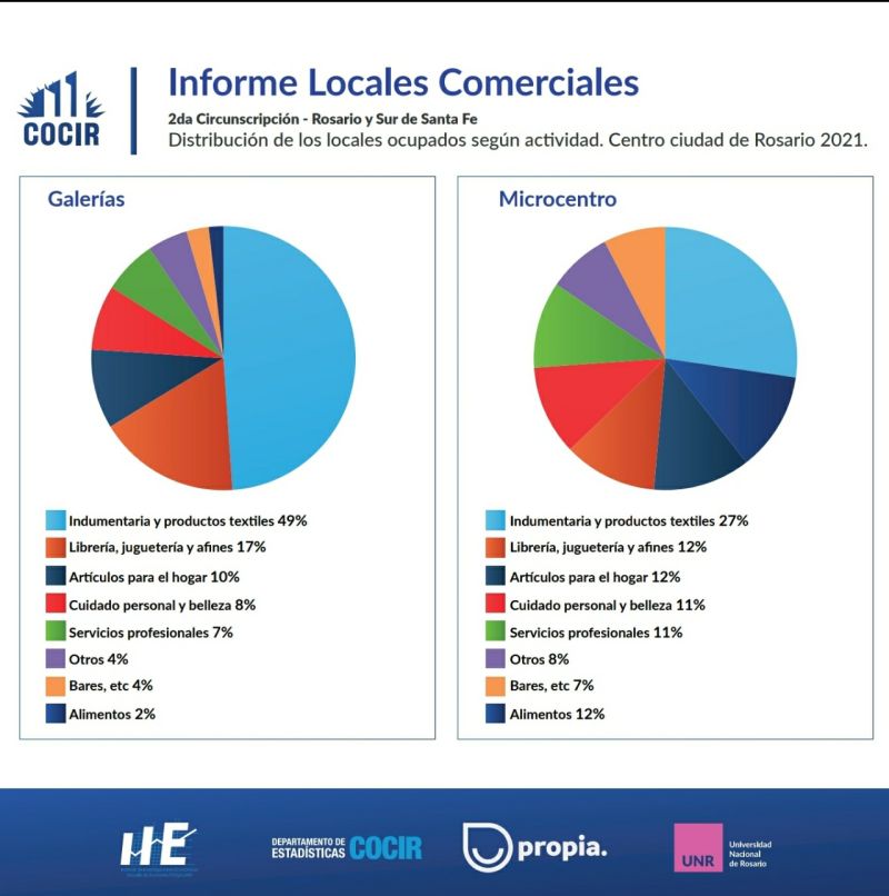 Los datos corresponden al último relevamiento del Colegio de Corredores Inmobiliarios de Rosario (COCIR), realizado junto al Instituto de Investigaciones Económicas (IIE) de la Universidad Nacional de Rosario (UNR). En el informe también se detalla que en toda el área central, la mayor cantidad de locales pertenecen a los rubros de alimentos e indumentaria y productos textiles con proporciones de 20% y 19%. En el microcentro, el rubro indumentaria alcanza el 27%, y en las galerías el 49%.