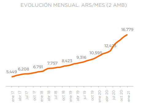 Un estudio llevado a cabo por el portal de clasificados Zonaprop reveló que el precio medio de alquiler de un departamento de dos ambientes subió 2.3% en el mes de enero, por debajo de la inflación de ese mes que se ubicó en torno al 4%. Vale aclarar que durante el 2020, los precios de alquiler subieron 54.7%, lo que implica 18pp por encima de la inflación (36%).
