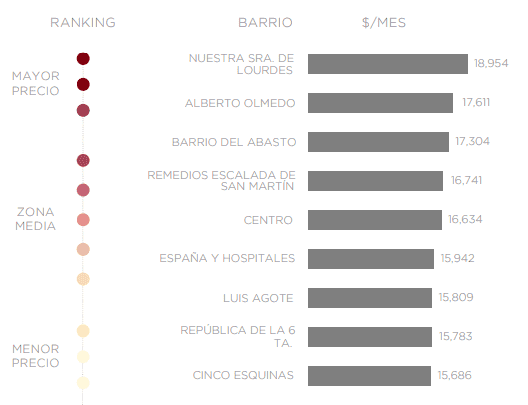El informe destaca que el barrio más caro para alquilar hoy en día en Rosario es Nuestra Señora de Lourdes, delimitado por las siguientes calles: Boulevard Oroño al este, Av. Pellegrini al sur, Calle Córdoba al norte, y calle Vera Mujica al oeste. Le sigue en valor el barrio Alberto Olmedo, popularmente conocido como Pichincha. En tercer lugar aparece barrio Abasto, cuyos límites son Av. Pellegrini, la calle Maipú, el Bv. 27 de Febrero y el parque Independencia.