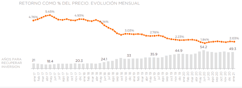 Además, desde el portal destacan que la relación alquiler/precio culmina el año en 2.03% anual. Se necesitan 49.3 años de alquiler para repagar la inversión de compra, lo que se traduce en un 10% más que un año atrás