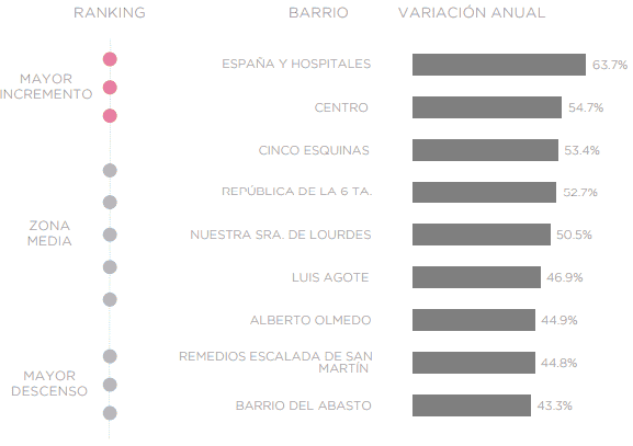 En cuanto a los barrios que tuvieron el mayor incremento de precios interanual, el primer lugar es para España y Hospitales, cuya zona se encuentra delimitada por Boulevard 27 de Febrero al norte, con Av. San Martín al este, al sur con General Las Heras y Domingo Matheu en el Boulevard Seguí, y al oeste con la calle Mariano Moreno. Le sigue en aumento la zona céntrica de Rosario.