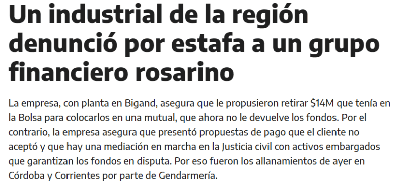 La demanda fue presentada por un industrial de Bigand en la que indicó que operaba en Bolsa a través de ellos. Pero un día le propusieron sacar sus fondos de la Bolsa, alrededor de 14 millones, y colocarlos con una mejor tasa de interés en la mutual del Grupo América, llamada Pedro de Mendoza.