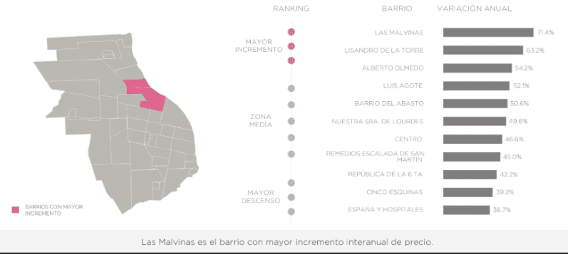 Según la infografía de Zonaprop, el barrio más caro para alquilar es Malvinas Argentina, ex Refinería, en donde se encuentra ubicada la zona de Puerto Norte y se están llevando a adelante un montón de edificaciones premium. Le sigue en costos el barrio Lisandro de la Torre, popularmente llamado Arroyito, en la zona norte de la ciudad y en tercer lugar el barrio Alberto Olmedo, donde se encuentra la zona conocida como Pichincha, en el centro norte de la ciudad.