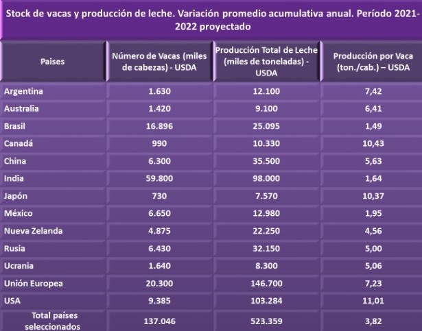 En la Unión Europea, se pronostica que la producción de leche aumentará un 1% por ciento en 2022 a 146,7 millones de toneladas. Los expertos del Observatorio señalaron que “siguiendo un patrón de larga data, se espera que el número de vacas lecheras se contraiga en un 1%, pero es probable que esto se compense con un aumento del 2% en la producción de leche por vaca”.