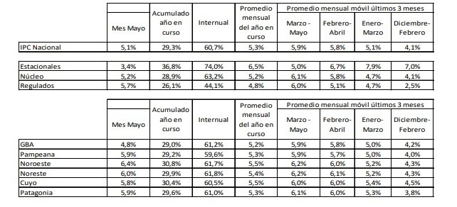 El Indec dio a conocer este martes los datos del Índice de Precios al Consumidor (IPC) correspondientes al mes de mayo y ubicó la inflación mensual en un 5,1%. con una acumulado de 29,3% para los primeros cinco meses del año y una inflación interanual del 60,7%.