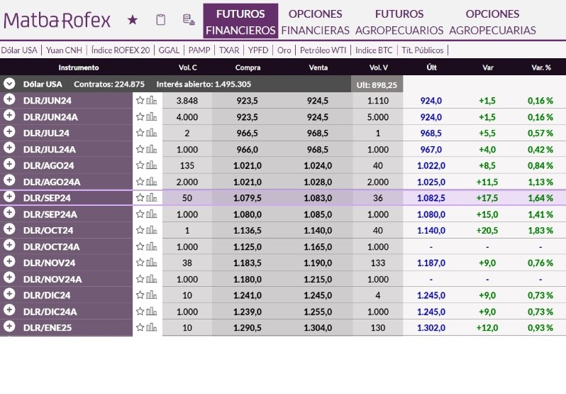 Frente a todas dudas, la posición agosto de dólar futuro en el Matba-Rofex cotiza 1.025 pesos (casi 12 pesos más que ayer), mientras que para septiembre se ubica en los 1.082,5 pesos, 17,5 pesos más que el miércoles.