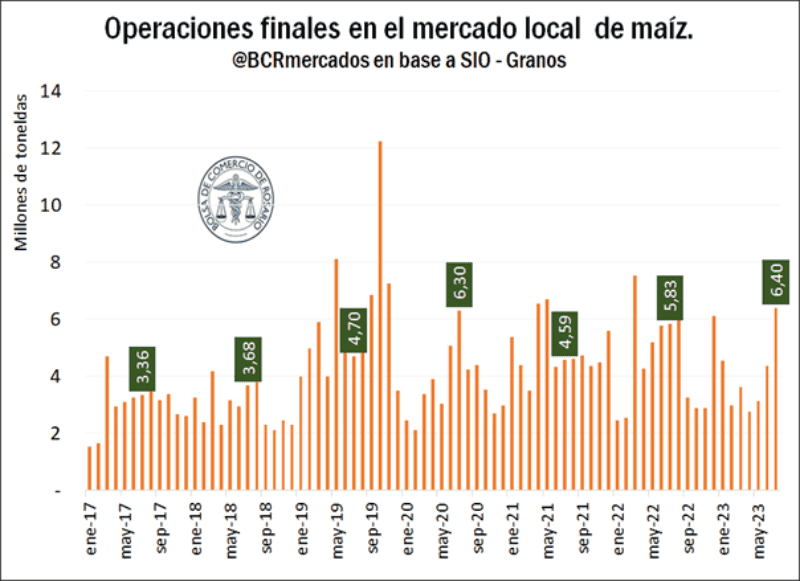 Por el lado de los negocios externos, el viernes 28 de julio se publicó en el Boletín Oficial una prórroga automática de 240 días de plazo para las DJVE de maíz con vencimiento del período de embarque entre el 24 de julio de 2023 y el 30 de septiembre de 2023. Esto descomprime la necesidad de los exportadores de originar la mercadería para los embarques previamente programados entre esas fechas, siendo habilitados para cumplimentar los mismos en plazos en los que ya ingresaría mercadería de la cosecha 2023/24.