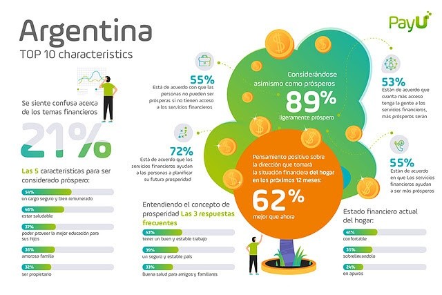 El 55% de los argentinos creen que la prosperidad está directamente relacionada con el acceso a los servicios financieros, según un estudio realizado por PayU, donde los argentinos relacionan la palabra prosperidad con tres conceptos: tener un trabajo bueno y estable, vivir en un país estable y seguro, y la buena salud de la familia y amigos.