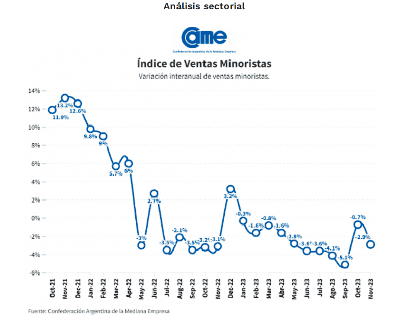 Así surge del Índice de Ventas Minoristas Pymes de la Confederación Argentina de la en Mediana Empresa (CAME), elaborado en base a un relevamiento mensual entre 1.320 comercios minoristas del país, realizado del 30 de noviembre y el 1 de diciembre.