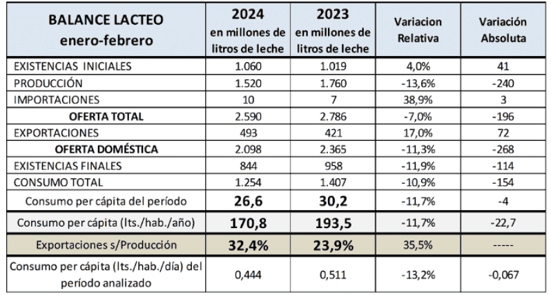 En el primer bimestre del 2024, el consumo per cápita sufrió una fuerte baja. De acuerdo a datos proporcionados por el Observatorio de la Cadena Láctea Argentina (OCLA), con información del INDEC y la Dirección Nacional Láctea, el volumen se ubicó en 170,8 millones de litros. Se trata de una de cifra notablemente inferior a la registrada en el mismo período de 2023: 190,5 millones de litros.