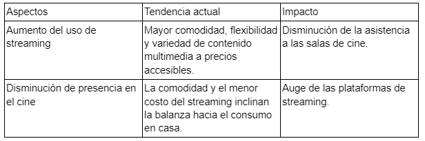 Experiencia social: no se replica la experiencia social de ir al cine con amigos o familiares, compartir y disfrutar de la película en una sala oscura con una gran pantalla.