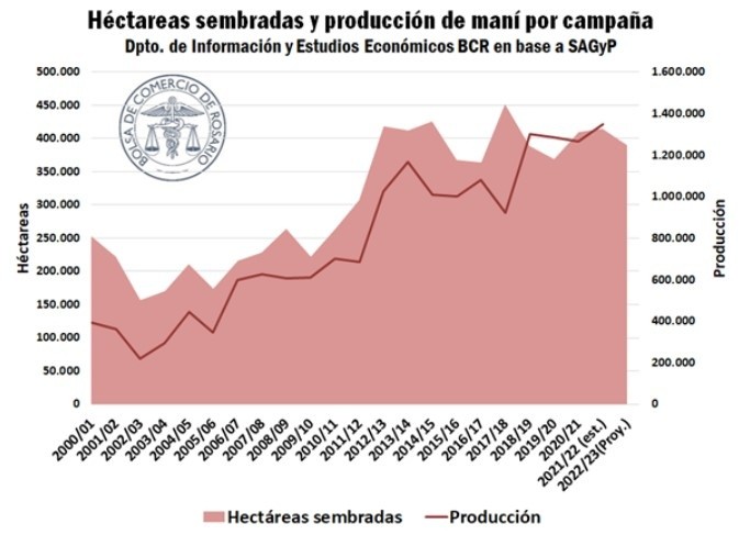 No obstante, el área sembrada de maní exhibió un fuerte crecimiento durante la primera década del nuevo milenio, para estabilizarse entre las 350.000 y 450.000 ha anuales en la última década. La producción, en tanto, acompaño el crecimiento del área hasta alcanzar un récord en la campaña anterior, según datos de la SAGyP.