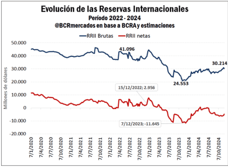 En cuanto a las reservas internacionales netas - descontados los pasivos de corto plazo - la actual gestión de gobierno asumió bajo una situación crítica, con un saldo negativo de u$s 11.645 millones a comienzos de diciembre de 2023. Sin embargo, de acuerdo a la visión de expertos de la BCR (Bruno Ferrari – Emilce Terré - Julio Calzada), gracias a un conjunto de políticas cambiarias, monetarias, comerciales y fiscales, se logró una rápida recomposición, alcanzando inclusive niveles levemente positivos a principios de abril de 2024.