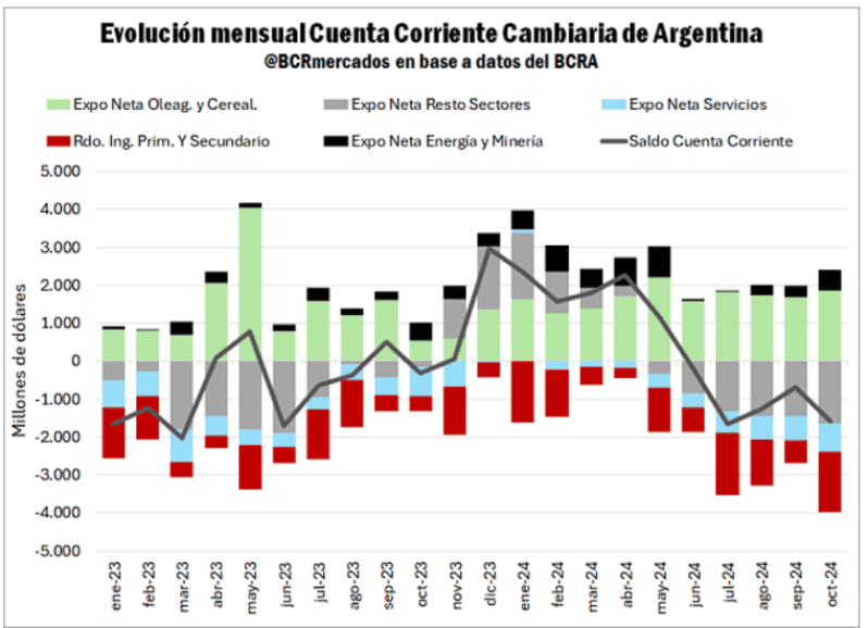 En la cuenta servicios, el año comenzó con un saldo prácticamente equilibrado, aunque desde junio comenzó a presionar la demanda neta de dólares, arribando en octubre el déficit más importante del año con un saldo negativo por u$s 744 millones. Por su parte, los pagos de intereses por ingreso primario experimentaron un marcado incremento desde julio hasta la actualidad.