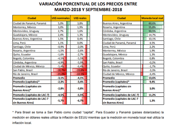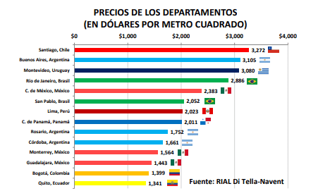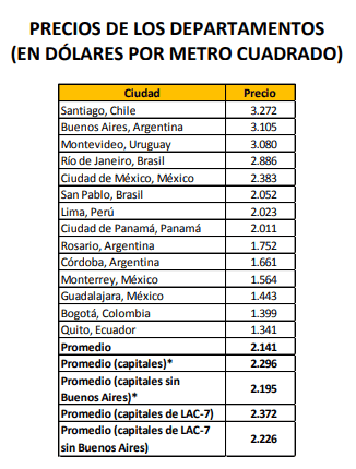 El relevamiento inmobiliario de América latina reporta el precio del metro cuadrado de departamentos en barrios de 14 ciudades de 9 países de América Latina que son comparables a lo que en Buenos Aires son Barrio Norte, Belgrano, Caballito y Recoleta. El cómputo se hace a partir del precio pedido en páginas de avisos clasificados de inmuebles, mayormente pertenecientes a la empresa Navent (ZonaProp).