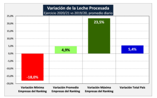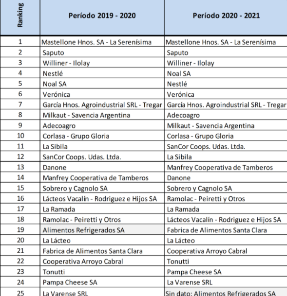 En la comparación con el Ranking 2019-2020 y 2020-2021, se puede observar que la empresa Noal SA avanzó un casillero por sobre Nestlé. También se dio este caso en lo que refiere a Adecoagro, que se ubicó por encima de Milkaut cuando en el período anterior se encontraba detrás suyo. Otra empresa que aumentó su producción fue Remolac - Peiretti y Otros, que subió dos posiciones.