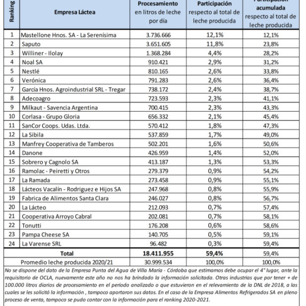 El Observatorio de la Cadena Láctea Argentina (Ocla) recopiló los datos sobre el volumen de leche procesada de las principales industrias del sector para armar su ranking. Según aclara, se tomó para su elaboración a todas aquellas empresas que hayan procesado más de 100.000 litros de leche promedio diario en el período comprendido entre el 1° de julio del 2020 y el 30 de junio del 2021.