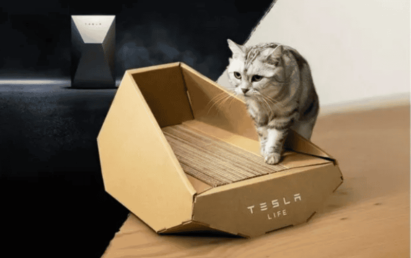 Lo que para muchos puede ser una simple caja de cartón, cuando lleva la marca Tesla, el cristal con que se la mira cambia. Es una especie de bandeja para gatos que mide 56 centímetros por 41 x 25 centímetros. Se la conoce como una bandeja para gatos Cybertruck. Está a la venta en la versión china del sitio web de Tesla a 13 dólares.