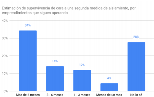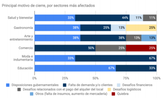 Según el estudio, la principal preocupación a corto plazo reside en la falta de demanda o clientes (56%) y casi un tercio de los emprendimientos que siguen operando (28%) no sabe cuánto tiempo podría sobrevivir frente a las nuevas restricciones para frenar los contagios en el país.