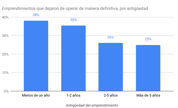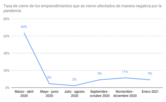 Según un relevamiento realizado en marzo de este año por la Asociación de Emprendedores de Argentina (ASEA), más de un cuarto de los emprendimientos afectados por la pandemia (27%) se vio forzado a cerrar de manera definitiva. La gran mayoría (64%) dejó de operar durante los primeros meses, entre marzo y abril de 2020, mientras que un 20% de los afectados reportó una tasa de supervivencia mayor, con un cierre entre el período de septiembre y diciembre de 2020.