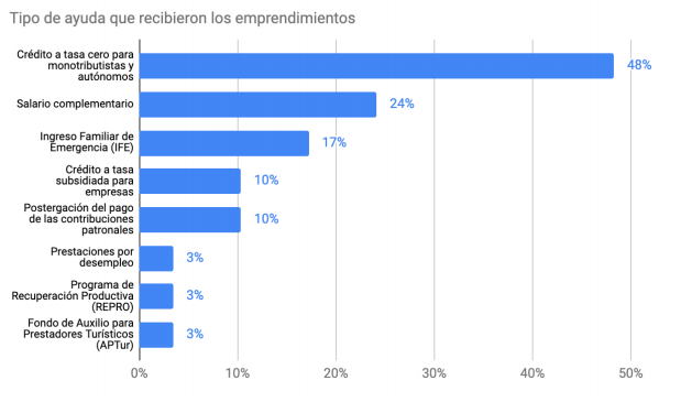 Por otro lado, un 18% de los emprendimientos afectados sí recibió ayuda del Estado. Casi la mitad (48%) consiguió créditos a tasa cero para monotributistas y autónomos y un cuarto de ellos (25%), salario complementario.