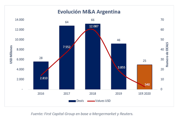 Durante el primer semestre de 2020 se completaron 25 transacciones de M&A por un valor de aproximadamente USD 540 millones. Si se comparan dichos valores con el mismo periodo de 2019, la cantidad de operaciones disminuyó un 25%, y un 85% en sus valores de transacción.