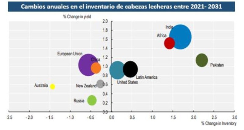 Se prevé que el comercio mundial de productos lácteos se expanda durante la próxima década para llegar a 14,2 MTM en 2031, un 15 % más que durante el período base. Las tasas de crecimiento varían según los productos lácteos, con un 1,7 % anual para LPD, 1,6% anual para queso, 1,5% para suero en polvo, 1,3% para manteca y 0,9% para LPE.