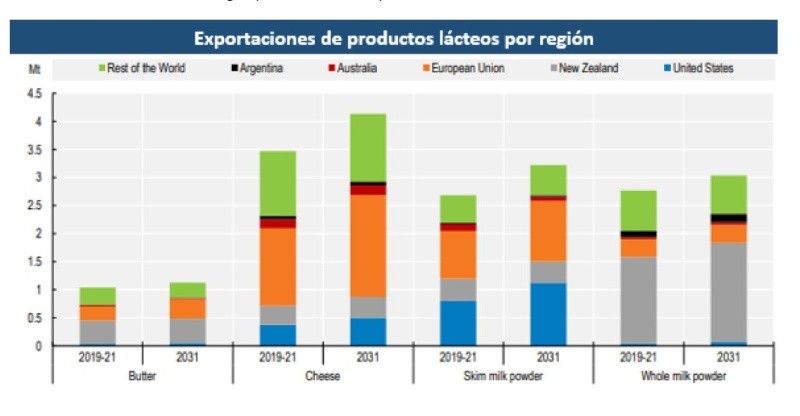 La mayor parte de este crecimiento se cubrirá con mayores exportaciones de los EE.UU., la UE y Nueva Zelanda. Australia, otro exportador que ha perdido cuota de mercado aunque sigue siendo un destacado exportador de queso y LPD. En el caso de LPE, Argentina también es un importante exportador y se proyecta que represente el 5% de las exportaciones mundiales para 2031. En los últimos años, Bielorrusia se ha convertido en un importante exportador, orientando sus exportaciones principalmente al mercado ruso debido al embargo que sufre dicho país.