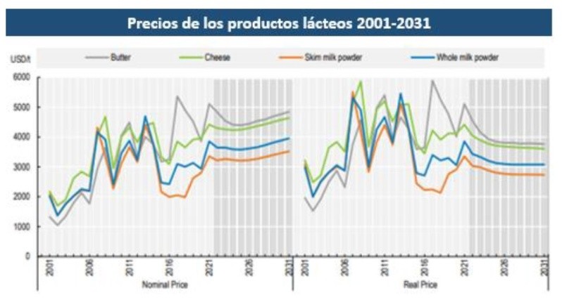 La fuerte volatilidad de los precios internacionales de los productos lácteos se deriva de su pequeña participación en el comercio, el predominio de unos pocos exportadores y un entorno de política comercial ampliamente restrictivo. Desde 2015, el precio de la manteca ha aumentado considerablemente más que la LPD. Debido a la mayor demanda de grasa, se supone que la brecha entre ambos seguirá durante la próxima década; aunque se espera que se reduzca.