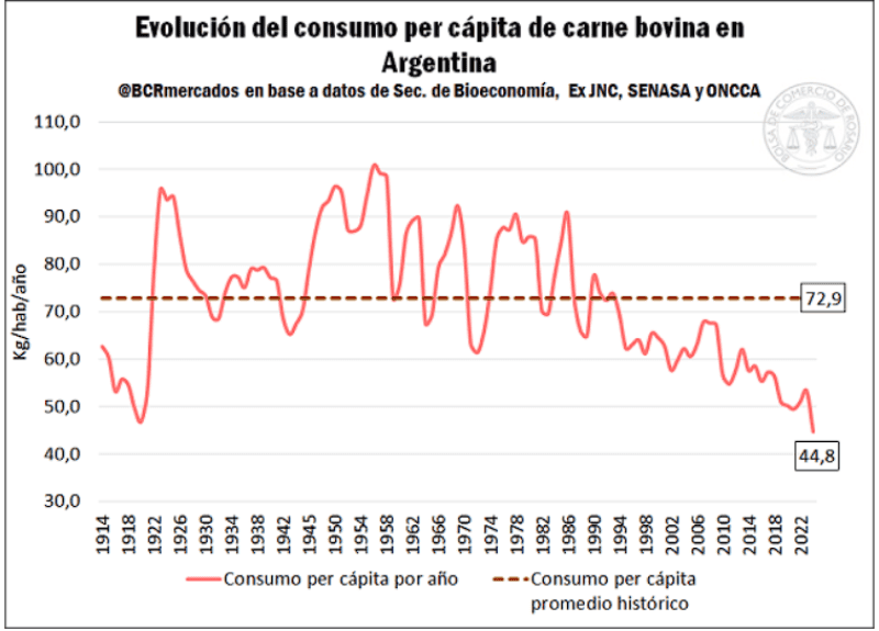El consumo de carne vacuna en Argentina se encuentra en una tendencia decreciente desde la segunda mitad del siglo pasado, en la medida en que ha ido siendo sustituida por otras fuentes de proteínas. Esta tendencia se ve agravada por la actual recesión que está atravesando la economía argentina y que lleva a muchos consumidores a inclinarse por el consumo de pollo y cerdo, siendo estas alternativas más económicas. Como resultado de estos escenarios, en 2024, de acuerdo a un informe de expertos de la Bolsa de Comercio de Rosario (Franco Ramseyer y Emilce Terré), el consumo de carne bovina en Argentina podría llegar a ser el más bajo desde que se cuenta con datos, es decir, en al menos 110 años.