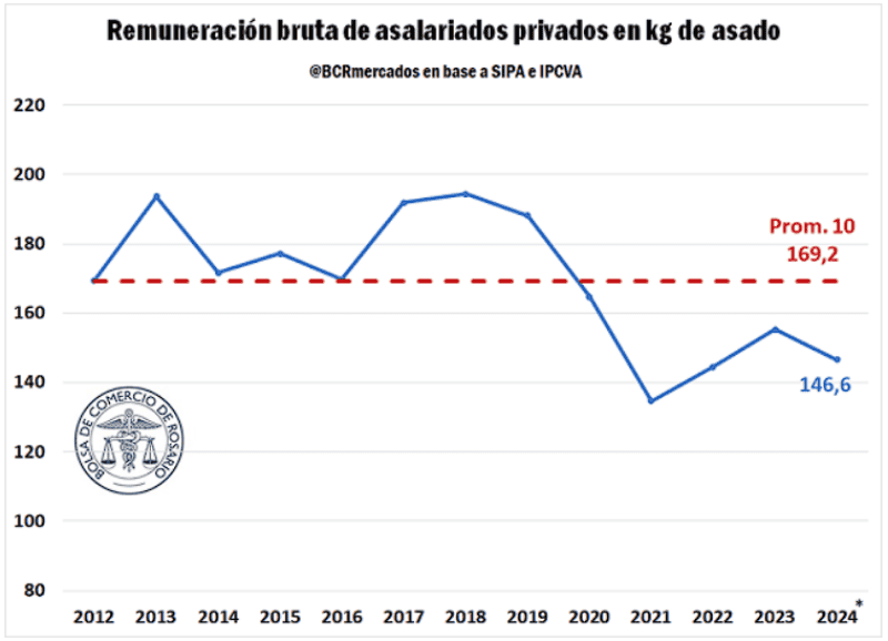 Otro indicador que puede interesar a este análisis es ver la evolución de la capacidad adquisitiva de los salarios en cuanto a carne. Para esto, se utilizan los datos de remuneraciones del Sistema Integrado Previsional Argentino (SIPA), y los precios del kg de asado, relevados del Instituto de Promoción de la Carne Vacuna Argentina (IPCVA).