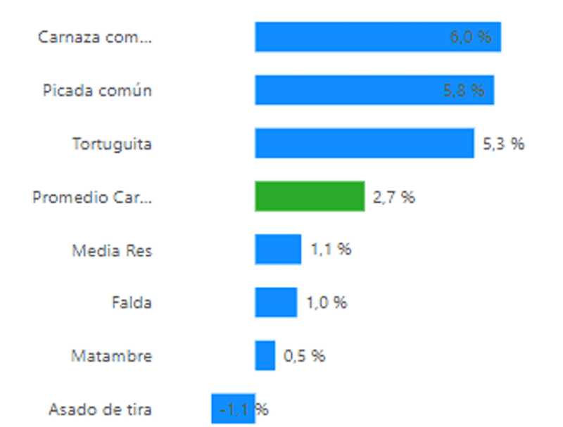 Las mayores subas de precios en junio, en la plaza rosarina, se dieron en la carnaza común (6%), la picada común (5,8%) y la tortuguita (5,3%). En cambio, los de menores variaciones fueron el matambre (0,5%) y la falda (1%), y el asado sufrió un descenso en su precio de 1,1%.