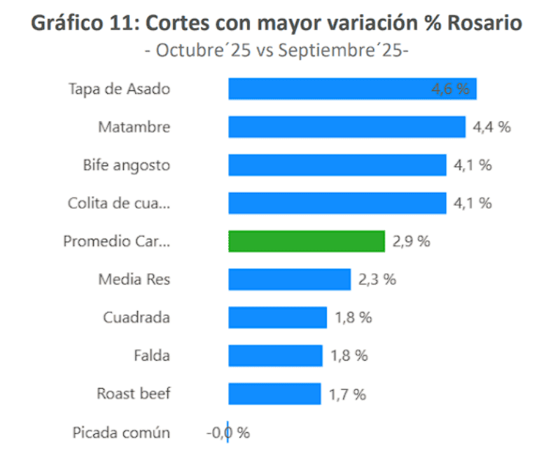 Las mayores subas de precios en octubre 2025 en esta plaza se dieron en la tapa de asado (4,6%), el matambre (4,4%) y la colita de cuadril y el bife angosto (4,1%). En cambio los que no han sufrido grandes variaciones en sus precios fueron la picada común (0%), el roast beef (1,7%) y la falda y cuadrada (1,8%).
