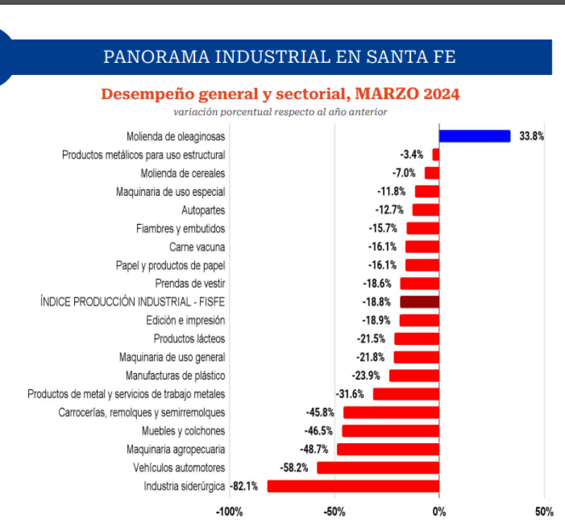 Desde la perspectiva sectorial, en la provincia de Santa Fe la retracción de la producción resultó prácticamente total: el 89% de las ramas manufactureras presentó una caída de su nivel de actividad respecto al mismo mes del año anterior. "Este resultado se asemeja sólo al período de aislamiento por la pandemia covid-19 (marzo-mayo 2020)", describe el informe.
