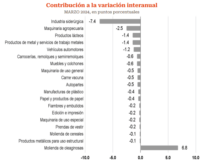 Molienda de oleaginosas fue la única actividad sectorial de contribución positiva (+6,8 p.p.). Descontando este efecto sectorial compensador, la producción industrial en la provincia de Santa Fe hubiese registrado una disminución de 24.8% interanual.