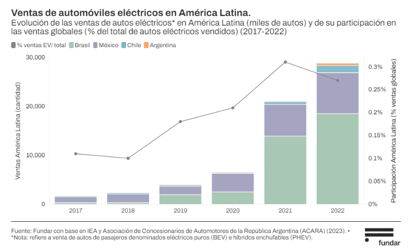 Mientras, en la región latinoamericana el camino hacia la electromovilidad apenas comienza a trazarse. A pesar del crecimiento exponencial en las ventas, su participación en el mercado global sigue siendo mínima (0,27%). Brasil y México destacan como líderes en este mercado a nivel regional, mientras que Argentina se ubica rezagada con apenas 365 unidades vendidas en 2022.