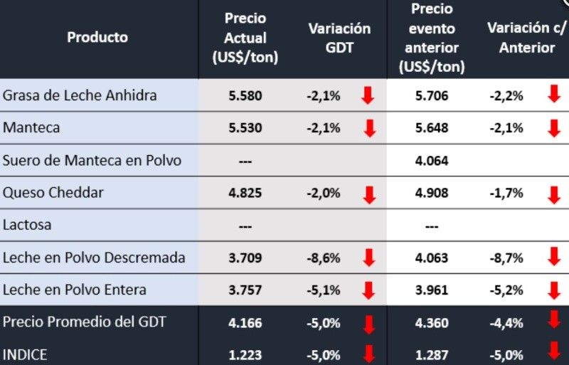 El mercado lácteo registró un "sacudón" este martes, luego de confirmarse las bajas para todos los productos en el evento N° 312 del Global Diary Trade.