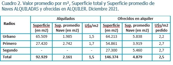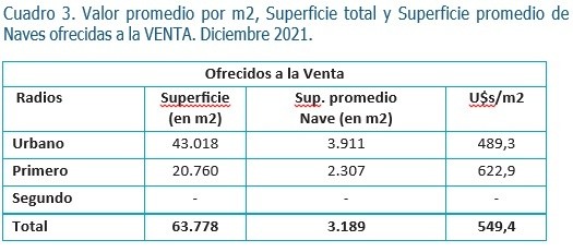 El valor promedio ofrecido a diciembre de 2021 de los galpones industriales y/o depósitos para la venta asciende a 549,4 U$s/m². El primer radio presenta valores promedios ofrecidos superiores a los del radio urbano. Mientras que el valor promedio pedido es de 622,9 U$s/m² en el primer radio, con naves de superficie promedio de 2.307 m², en el radio urbano es de 489,3 U$s/m² con naves de tamaño promedio de 3.911 m².