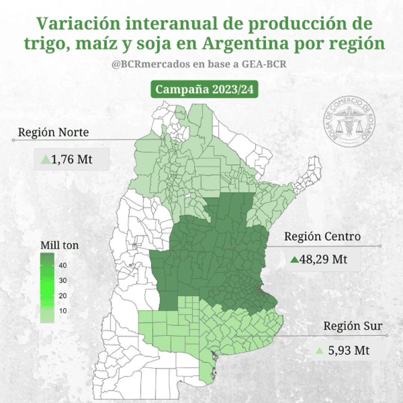 En otras palabras, la gran recuperación de la producción se da en la Región Centro, debido a que es la zona que más había sufrido la sequía el año previo. Esto impacta de lleno en la logística de la zona, particularmente en el volumen de mercadería que recibirá el Gran Rosario para exportar como grano o como subproducto luego de alguna transformación industrial.