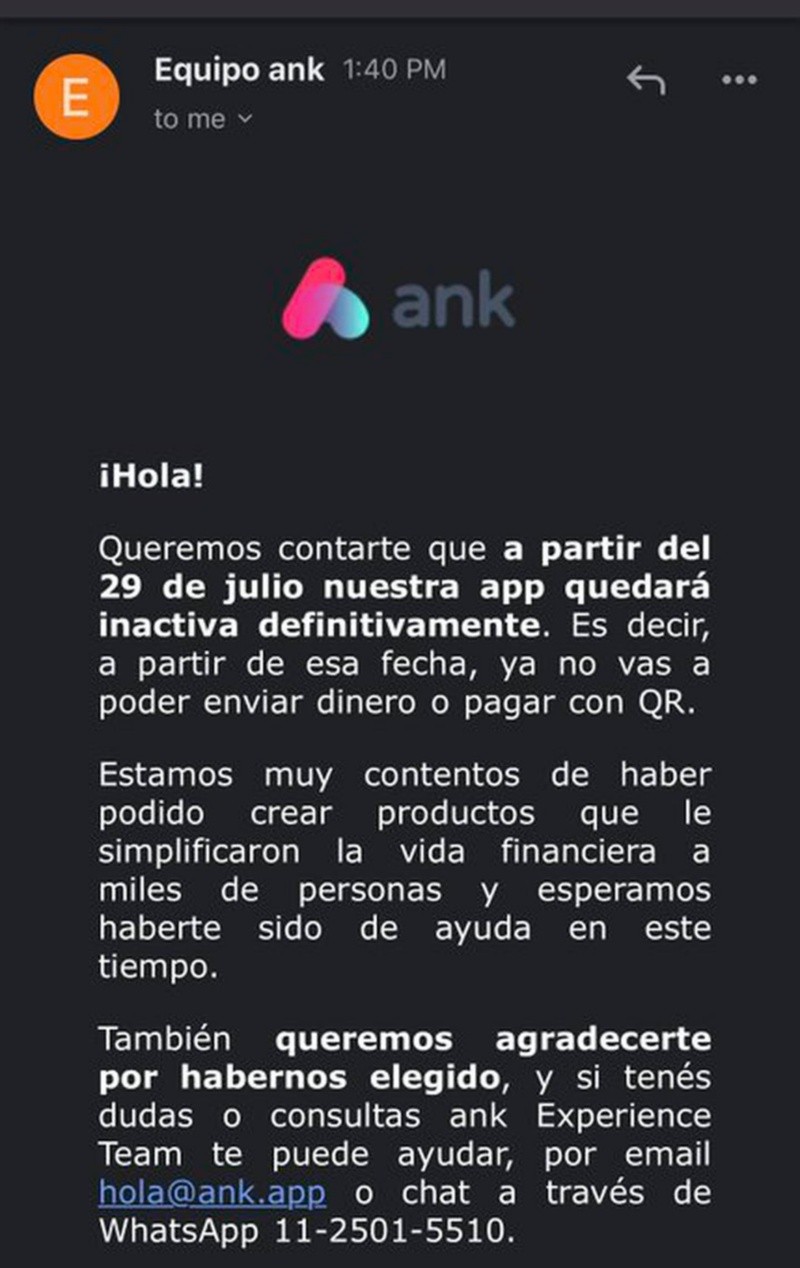 "Queremos contarte que a partir del 29 de julio nuestra app quedará inactiva definitivamente. Es decir, a partir de esa fecha, ya no vas a poder enviar dinero o pagar con QR. Estamos muy contentos de haber podido crear productos que le simplificaron la vida financiera a miles de personas y esperamos haberte sido de ayuda en este tiempo", explicaron.