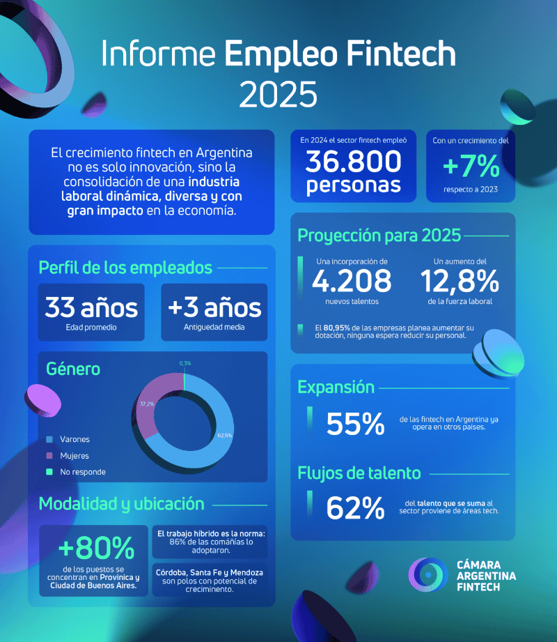 Al cierre de 2024, el sector fintech alcanzó los 36.800 empleos directos, con un crecimiento interanual del 7,14% respecto de 2023. Además, el informe revela que, para este 2025, las empresas proyectaron la incorporación de más de 4.200 nuevas personas, lo que representa un aumento del 12,8% en la dotación actual.