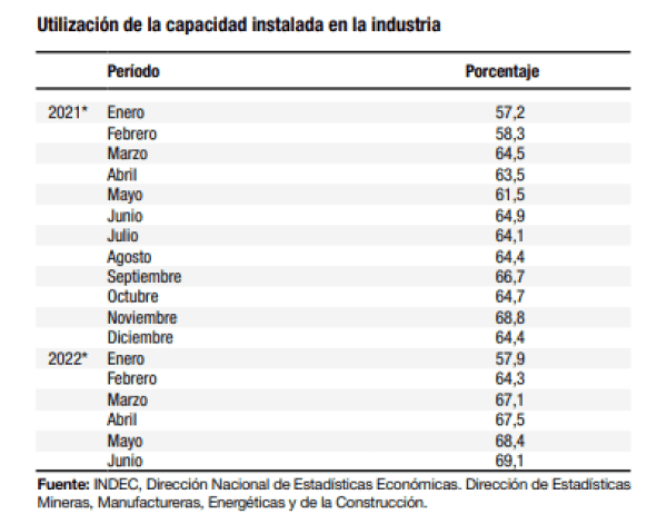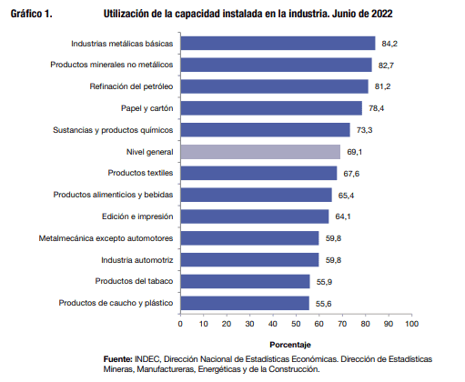 La utilización de la capacidad instalada en la industria, en junio de 2022, exhibió un nivel de 69,1%, superior al registrado en junio de 2021 (64,9%) y alcanzó el valor más alto en casi 5 años, según informó este miércoles el Instituto Nacional de Estadísticas y Censos (INDEC).