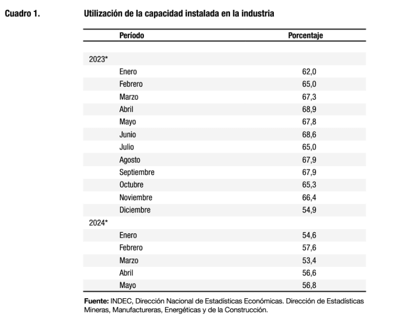 En mayo de 2024, la utilización de la capacidad instalada en la industria se ubica en 56,8%, nivel inferior al del mismo mes de 2023, que fue de 67,8%.